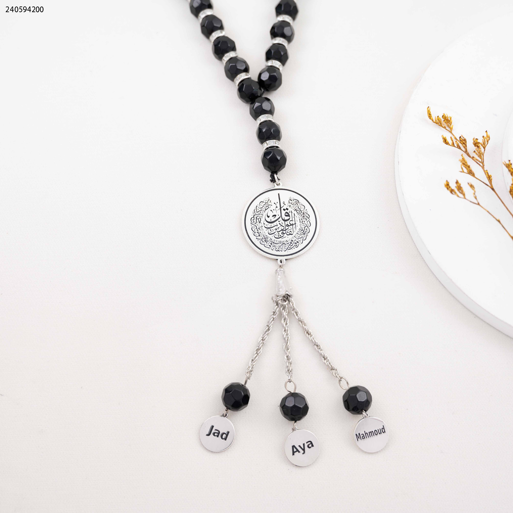 مسبحة بتصميم فاخر تصلح كتعليقة للسيارة مصنوعة من الفضة عيار 925 مع خرز أسود. القطعة المركزية مزخرفة بتفاصيل فريدة ونقش حسب الطلب، مما يجعلها هدية مميزة تناسب الشباب تصميم يلفت الأنظار ويضفي جمالاً كلاسيكياً لأي سيارة