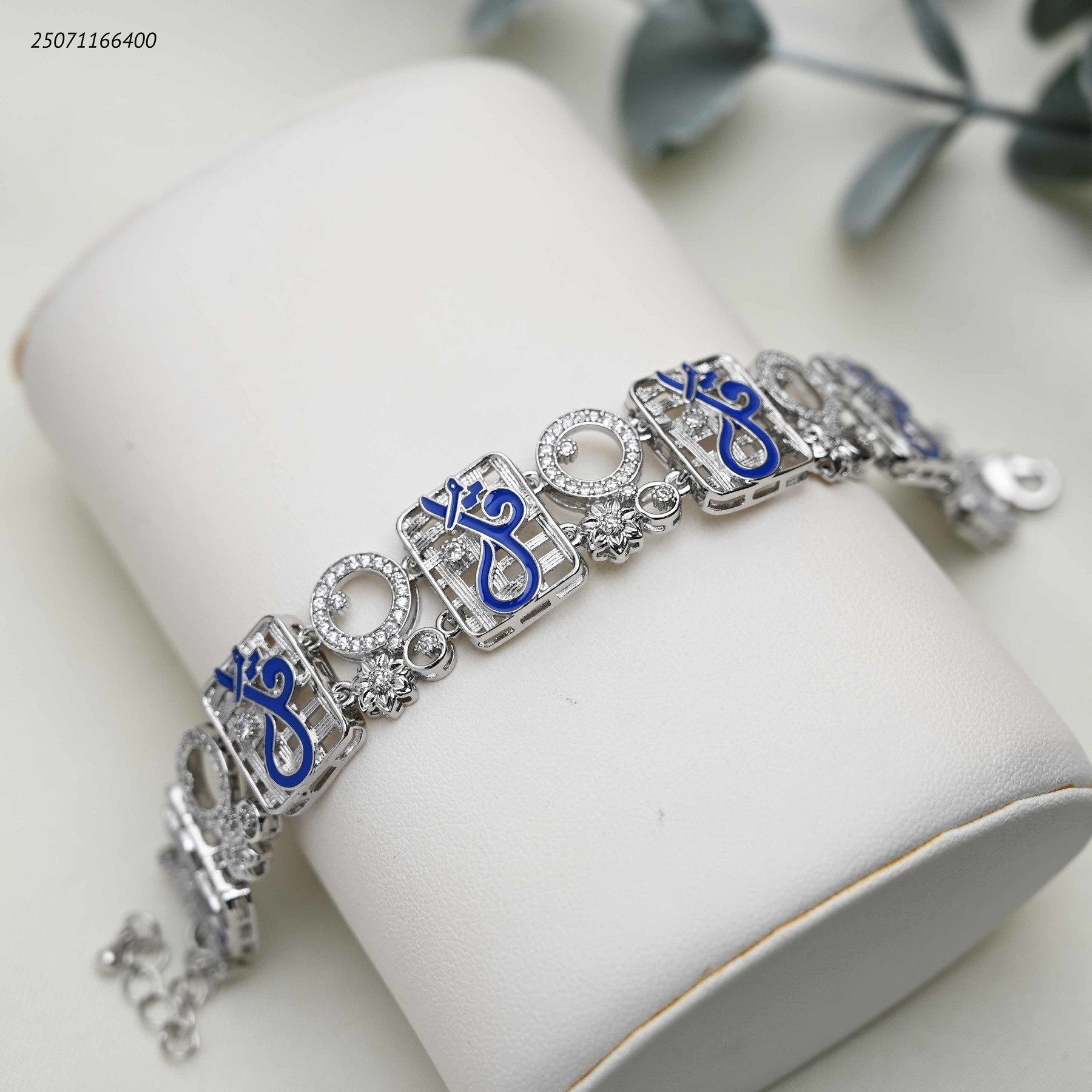 اسوارة عريضة عبارة عن قطع مربعة متشابكة مع زركون و كتابة بخط كحلي كلمة قل