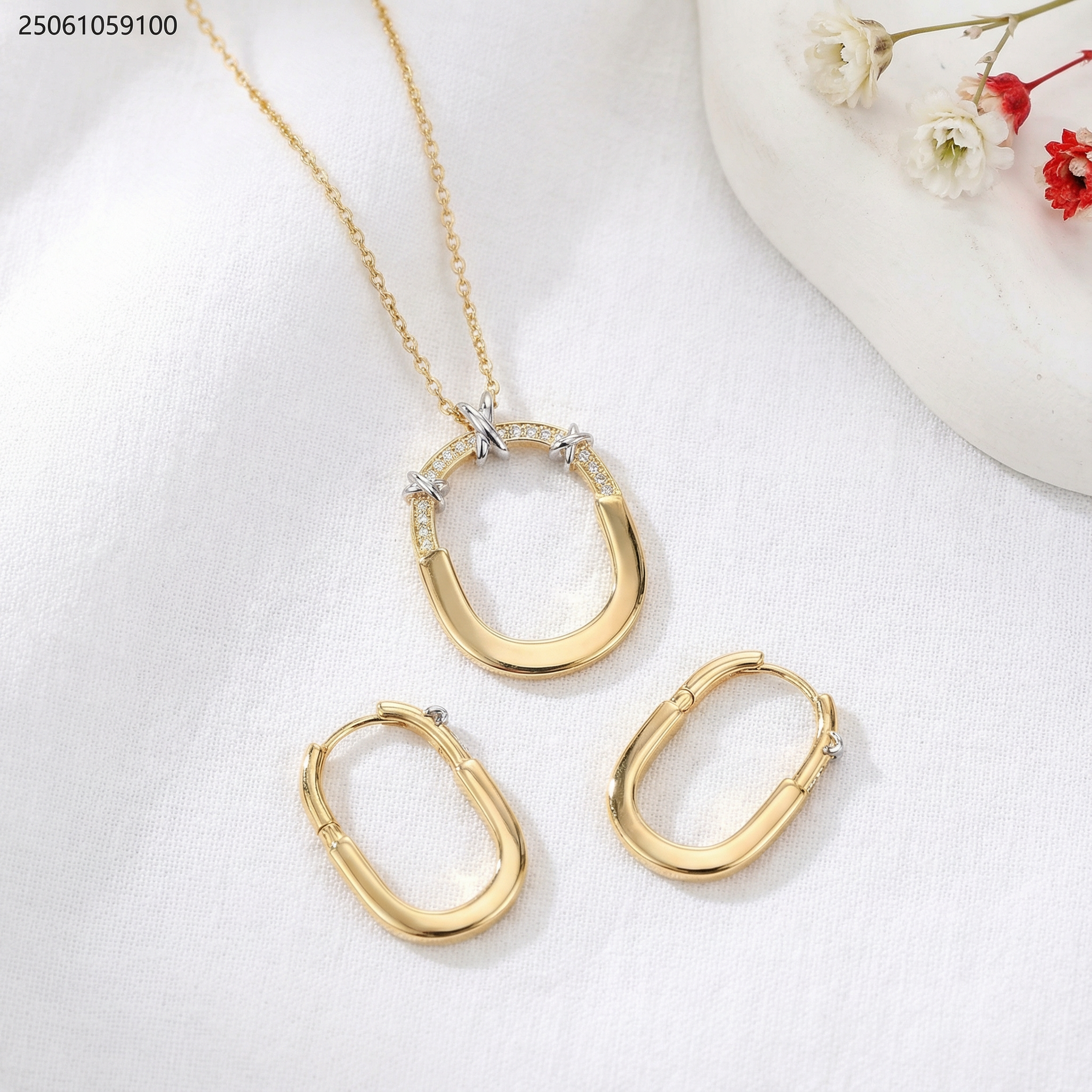 طقم شكل بيضاوي نصف زركون و الاخر سادة مع شكل اكس فضي اللون