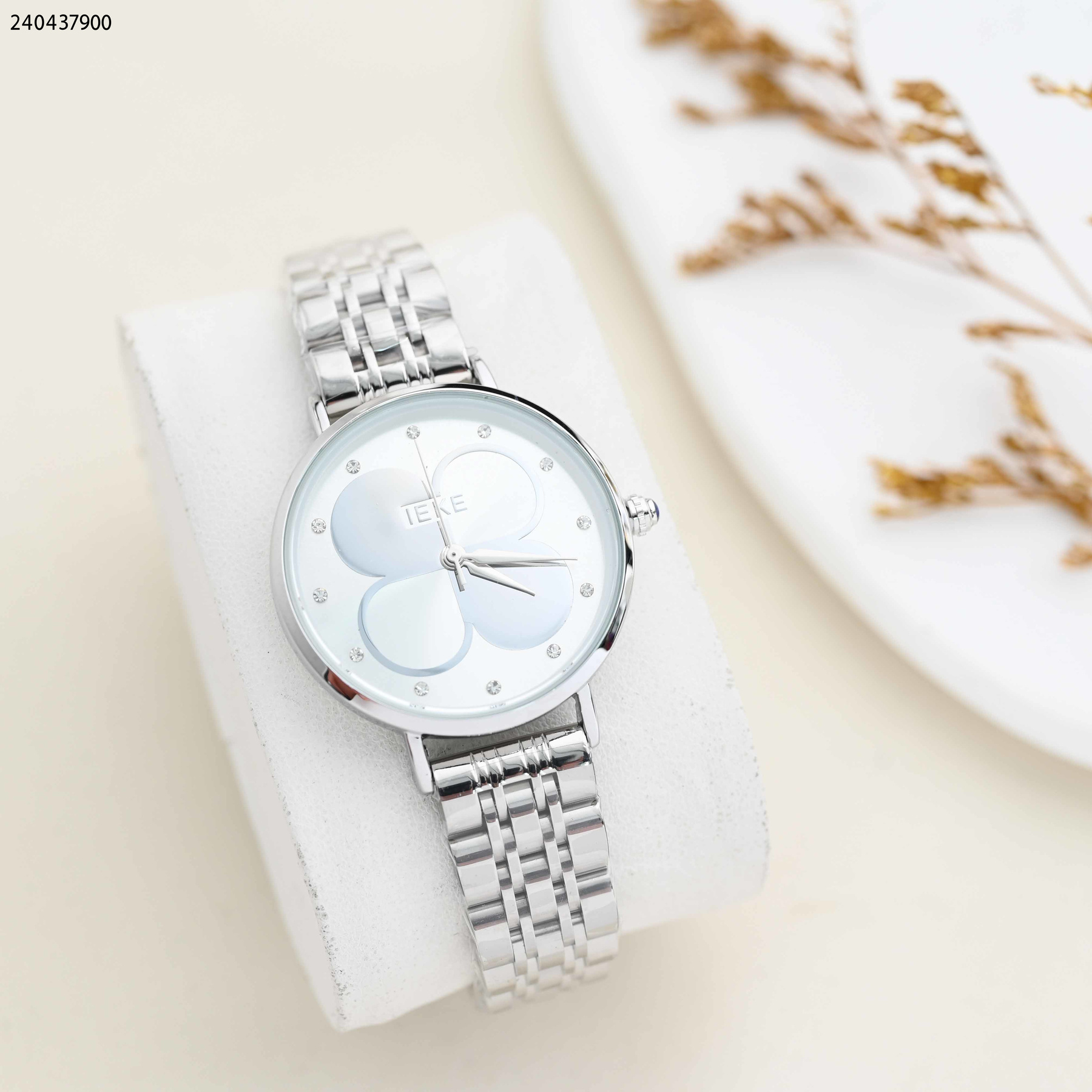 ساعة نسائية دائرية مع خلفية وردة البرسيم و حزام معدني