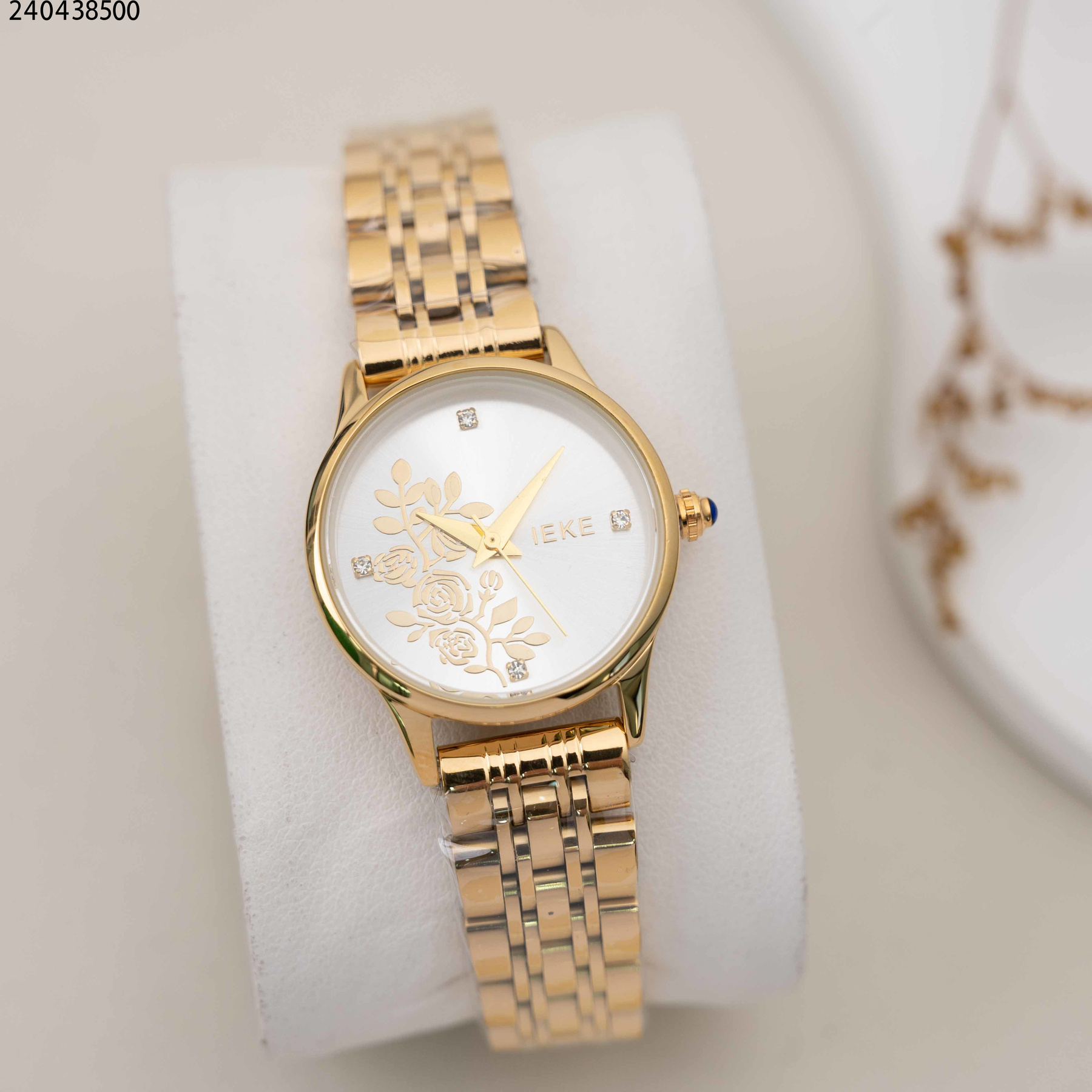 ساعة نسائية دائرية مع خلفية ورد و حزام معدني