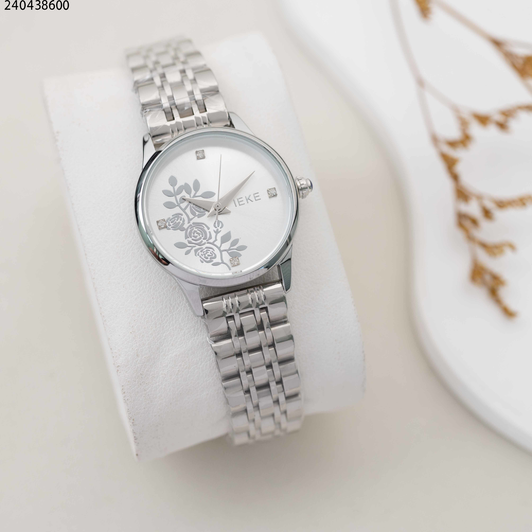 ساعة نسائية دائرية مع خلفية ورد و حزام معدني