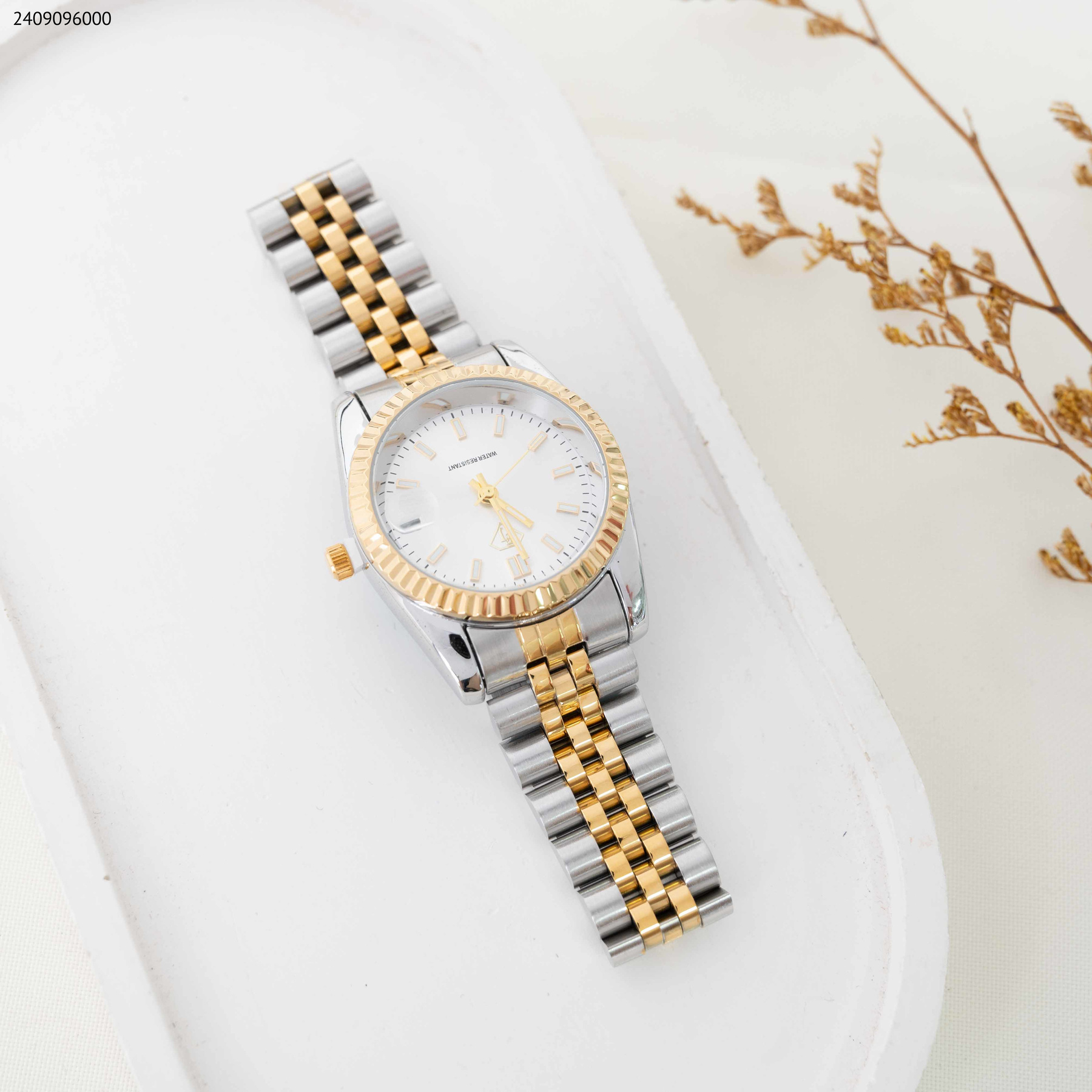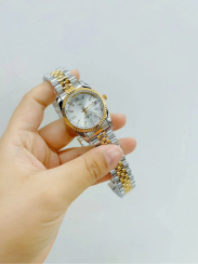 ساعة نسائية بتصميم دائري أنيق مرصعة بأحجار الزركون اللامعة التي تضفي بريقًا مع بحزام معدني مدموج باللون الفضي والذهبي مكفول اللون، مما يضمن لك تألقًا يدوم طويلاً دون تغيير اللون