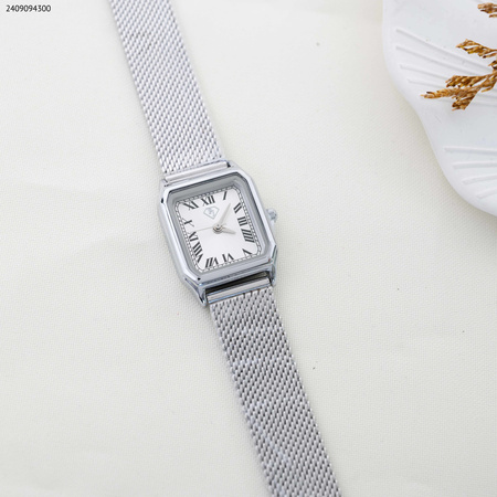 ساعة نسائية بتصميم مربع مع أرقام لاتينية كلاسيكية ، مزودة بحزام معدني متين ، تضفي لمسة من الأناقة والرقي .