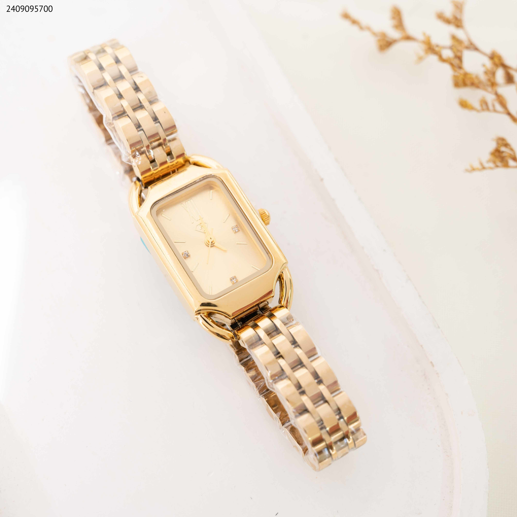 ساعة نسائية بتصميم مستطيل أنيق تأتي مع حزام معدني متين يضمن راحة وملاءمة مثالية وأرضية مع لون