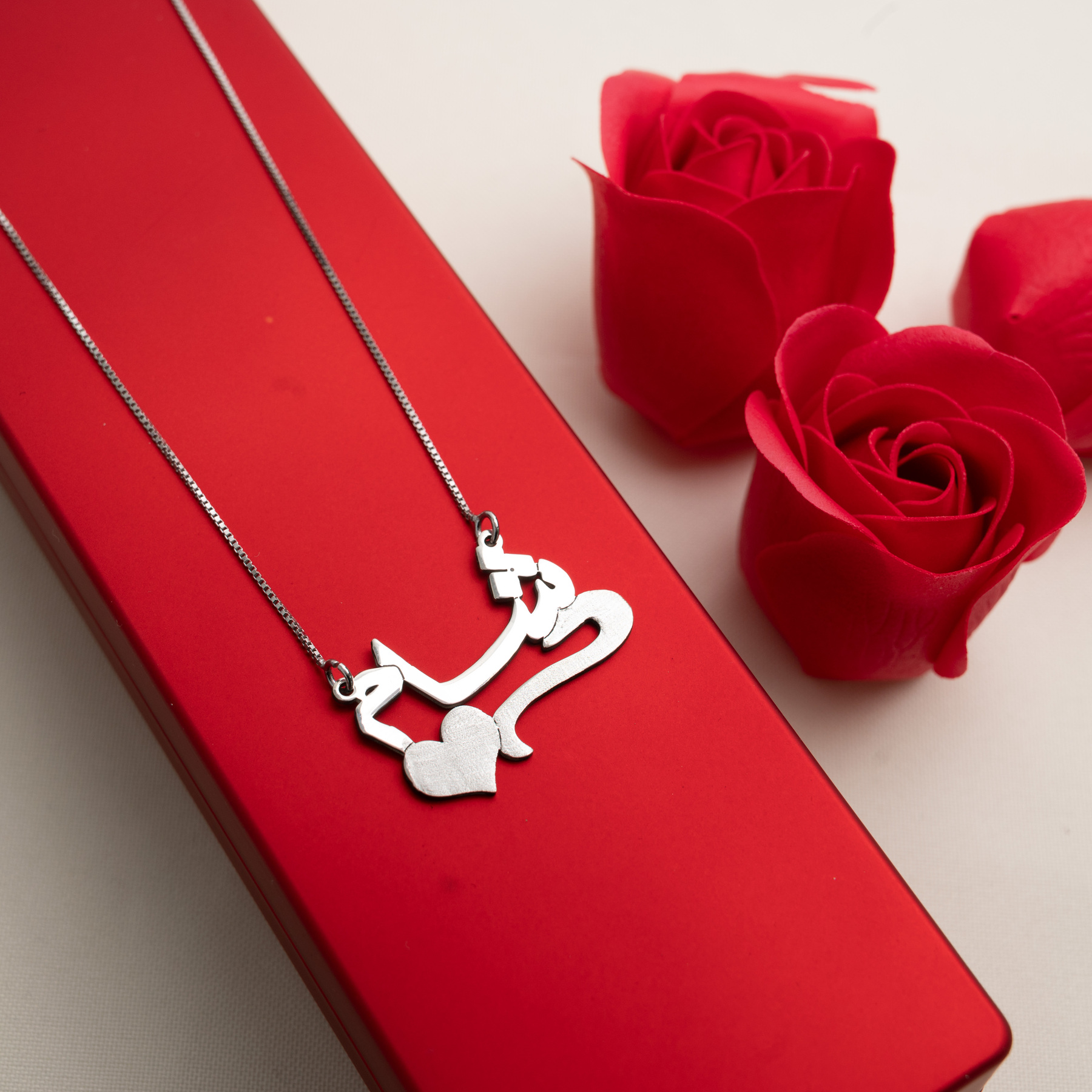 سنسال يضم اسمك أو اسم شخص تحبه بجانبه تصميم قلب أنيق. ليعبر عن الحب والرابط العميق بينكما. هدية مثالية لشخص مميز لتعبّر عن المشاعر بكل بساطة وجمال مصنوع بعناية من الفضة الأصلية عيار 925