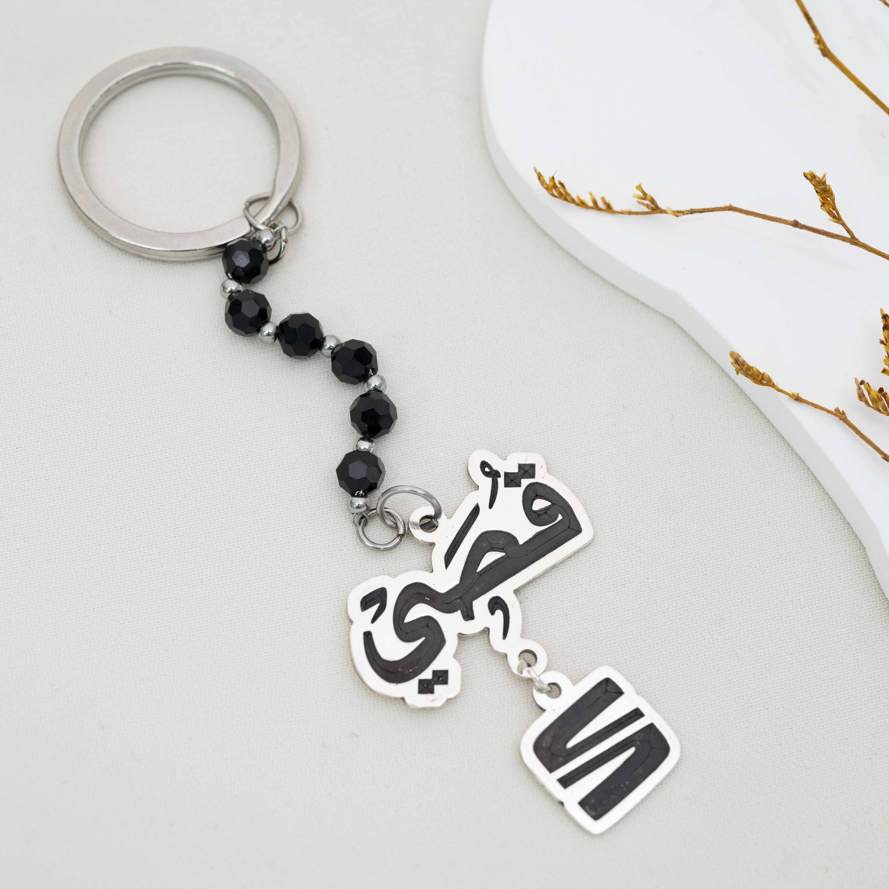 ميدالية مفاتيح أنيقة مصنوعة من الفضة عيار 925 اسمك او اسم الذي تحب مع تعليقة شعار السيارة مزينة بخرز أسود القطعة المركزية مصممة بتفاصيل مميزة ويمكن تخصيصها بالنقش حسب الطلب، تناسب النساء والرجال إضافة رائعة لأي مجموعة مفاتيح