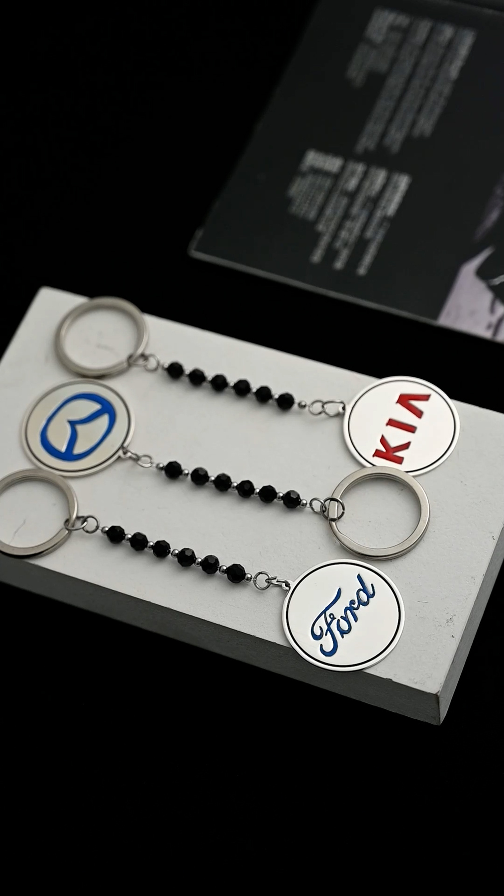 ميدالية مفاتيح أنيقة مصنوعة من الفضة عيار 925 مع الحفر من الجهتين حسب الطلب - شعار السيارة واسمها مع تلوين حسب الطلب مزينة بخرز أسود القطعة المركزية مصممة بتفاصيل مميزة ويمكن تخصيصها بالنقش حسب الطلب، تناسب النساء والرجال إضافة رائعة لأي مجموعة مفاتيح