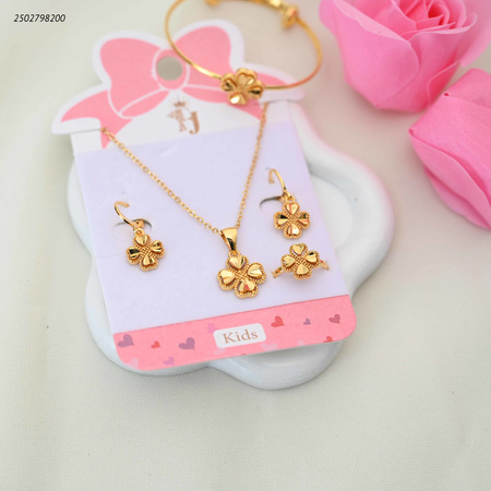 طقم مجوهرات للأطفال مطلي بالذهب: سوار، قلادة، حلقان، وخاتم بتصميم ذهبي.