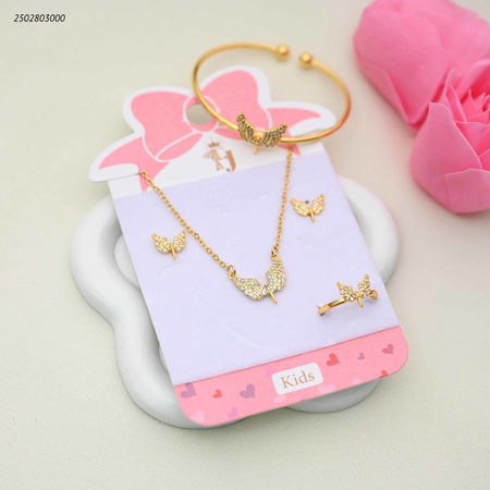 طقم للأطفال: سوار، سنسال، حلق، وخاتم بتصميم أجنحة مرصعة.