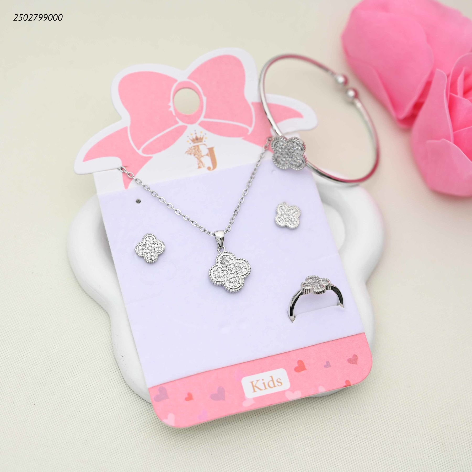 طقم للأطفال: سوار، قلادة، حلقان، وخاتم بتصميم زهرة رباعية الأوراق.