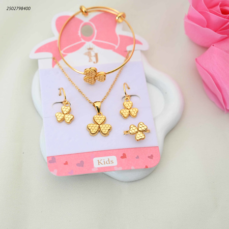 طقم مجوهرات للأطفال مطلي بالذهب: سوار، قلادة، حلقان، وخاتم بتصميم ذهبي.
