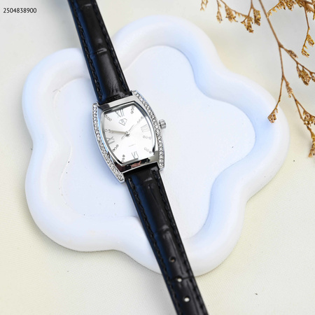 ساعة يد نسائية فضية أنيقة بحزام جلد أسود ومرصعة بالكريستال